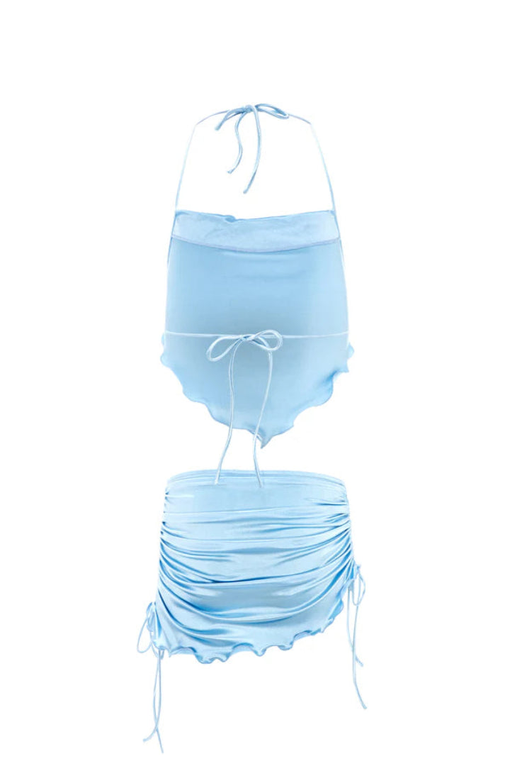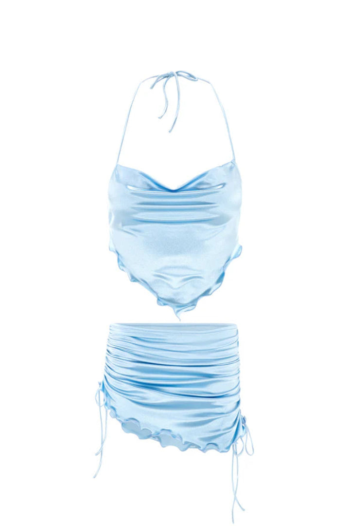 The set is cut from high-quality glossy swimwear fabric in Baby Blue making it perfect if you're dressing up for a night out or getting ready for a beach day.
