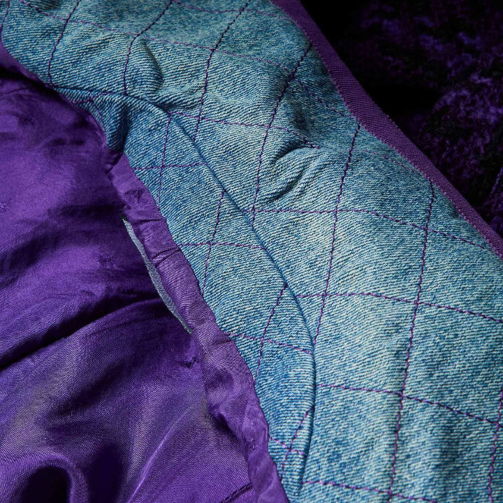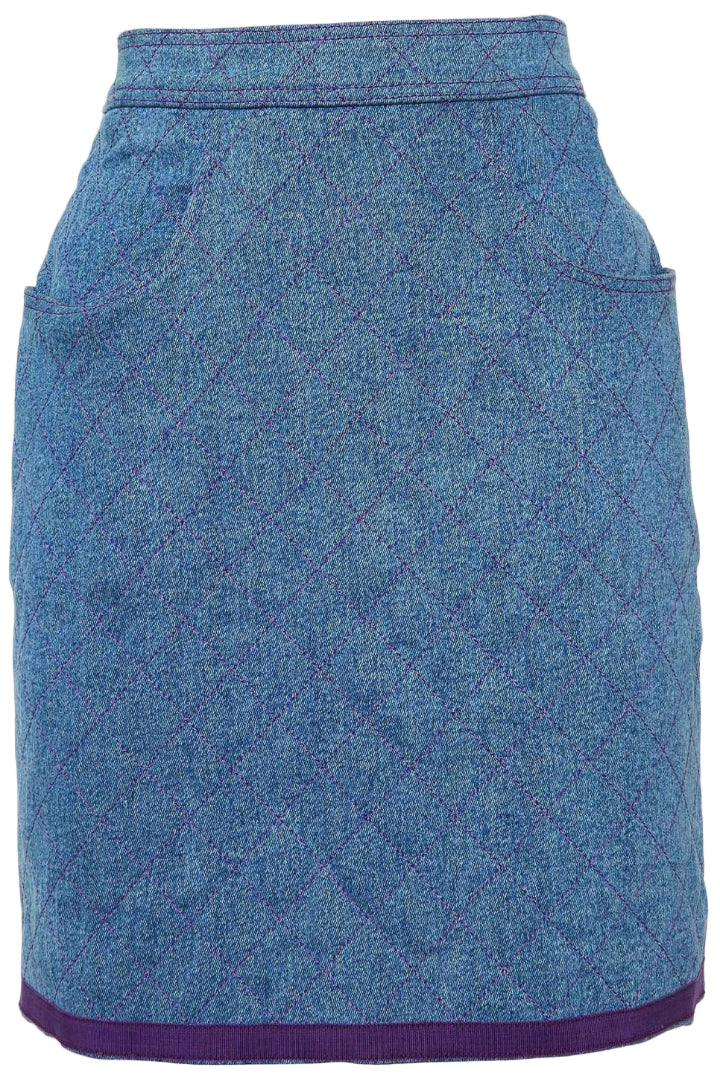 This vintage Chanel two-piece suit features a denim jacket and skirt in a distinctive purple-blue hue, size 26. Crafted with timeless elegance, the set combines classic Chanel tailoring with durable denim fabric, offering both style and comfort. Perfect for those seeking a unique, high-end ensemble that stands out with subtle sophistication and expert craftsmanship. Ideal for elevating your wardrobe with a rare designer piece that blends vintage charm and contemporary appeal.