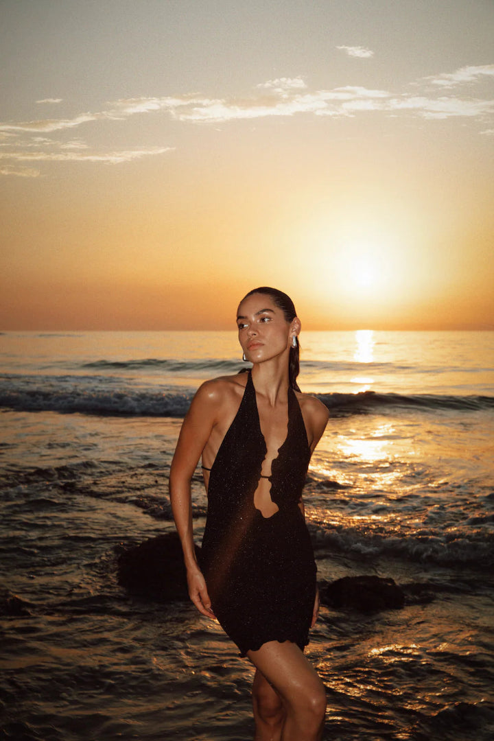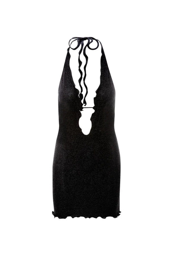 The Lyra Mini Dress showcases a chic halter neck with a tie closure, complemented by a daring low neckline and an alluring open back. Designed with high-quality sparkly lurex fabric.